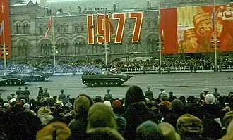 The 1977 October Revolution Parade was a military parade that took place in Red Square in Moscow on 7 November 1977 to commemorate the 60th anniversary (diamond jubilee) of the October Revolution. The annual parade marks the protest of the Bolsheviks against the Tsarist autocracy of the Russian Empire. The Soviet Communist Party General Secretary Leonid Brezhnev and Soviet Prime Minister Alexei Kosygin attended the parade, among other foreign leaders from the Warsaw Pact and allied countries who decided to fly in for the celebrations.[1] Marshal Dmitry Ustinov delivered his second holiday address to the Soviet people on this day, right after the parade inspection that had been presided over by him and led by the commander of the Moscow Military District Colonel General Vladimir Govorov. Music was performed by the Combined Military Band of the Moscow Garrison conducted by Colonel Nikolai Mikhailov. As per tradition, 14 other Soviet Cities (including Leningrad) held their parades on this day. A folding stock version of the AK-47 appeared in the contingent of troops from the Soviet Airborne Forces.[2] This parade included the updated anthem of the Soviet Union.[3]