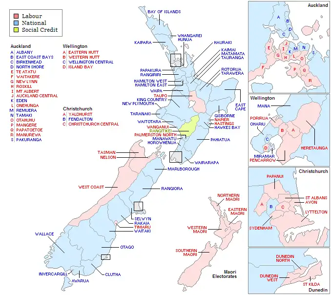 - ^ The election of Malcolm Douglas in Hunua was overturned by the Electoral Court on 24 May 1979