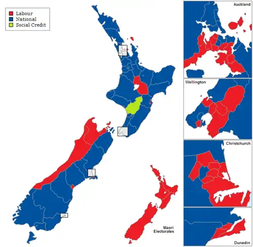 While National won a majority of seats in parliament, it did not actually win a majority of the vote. Labour received the highest number of votes, winning slightly more than forty percent. National, by contrast, won slightly less than forty percent. Social Credit, despite winning only one seat, actually received around sixteen percent of the vote. The election night result had National with more seats, but many seats had small majorities and it was conceivable that if special votes overturned enough electorates Labour could form a government.[15] Ultimately this did not eventuate however.