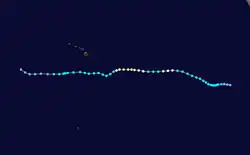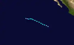 The season's second tropical cyclone began as a disturbance spawned by an African tropical wave southwest of the Mexico coastline on June 15.[4] It moved generally westward over very warm waters, and observations from satellite imagery and ships outlined the formation of a tropical depression by 00:00 UTC on June 17.[5] Six hours later, the depression intensified into Tropical Storm Bud.[6] Continued ship observations relayed Bud's intensification to a 60 mph (97 km/h) cyclone on June 18, but the storm weakened thereafter as it moved west-northwest under the influence of a ridge,[5] and it ultimately dissipated within the ITCZ after 06:00 UTC on June 26 while located over the open Central Pacific.[6][7]