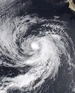 Two areas of disturbed weather focused south of the Gulf of Tehuantepec on October 1, one of which with origins as a tropical wave, underwent binary interaction and merged into one larger system the next day.[5] The disturbance was upgraded to a tropical depression around 18:00 UTC, and it further intensified into Tropical Storm Rosa by 00:00 UTC on October 3.[6] Rosa moved around the western periphery of an upper-level ridge,[5] strengthening over warm waters as it did so. The cyclone became a hurricane by 00:00 UTC on October 4, ultimately attaining peak winds of 85 mph (137 km/h) on October 4.[6] An aircraft reconnaissance plane intercepted the storm around this time, finding a 35 mi (56 km) elliptical eye open to the southwest.[5] Rosa moved northwest over colder waters, transitioning to an extratropical cyclone around 06:00 UTC on October 7 and ultimately dissipating west of Baja California after twelve hours.[5][6]