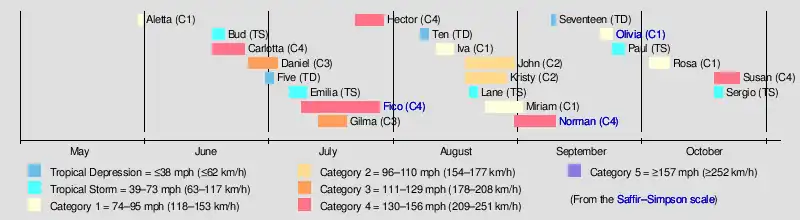 The 1978 Pacific hurricane season was the first Pacific hurricane season to use both masculine and feminine names for tropical cyclones. It also began the modern practice of utilizing naming lists every six years. Despite lacking an El Niño, a common driver of enhanced activity in the East and Central Pacific basins,[1] the 1978 season was active. It featured 19 named storms, 14 hurricanes, and 7 major hurricanes, the latter of which are Category 3 or stronger cyclones on the Saffir–Simpson scale. Within the confines of the Central Pacific basin, located between the International Date Line and 140°W, 13 tropical cyclones or their remnants were observed by forecasters at the Central Pacific Hurricane Center, a record number of occurrences at the time.[2] Seasonal activity began on May 30 and ended on October 21, within the limits of a traditional hurricane season which begins on May 15 in the East Pacific and June 1 in the Central Pacific. The season ends on November 30 in both basins. These dates conventionally delimit the period during each year when most tropical cyclones form.[3]