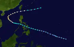 Olive would steadily intensify after it entered the South China Sea on April 20, being in an environment with good outflow aloft and warm Sea surface temperatures, resulting in it intensifying into a typhoon on April 22. Olive would recurve due to a break in the subtropical ridge, peaking with sustained winds of 100 mph (160 km/h) the next day. It accelerated to the east-northeast, steadily weakening due to intruding cool and dry air, resulting in the system becoming extratropical early on April 26.[1]