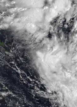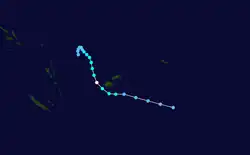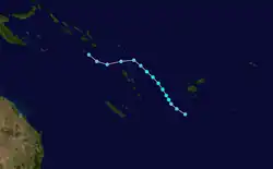 During January 9, the extratropical remnants of Tropical Cyclone Paul briefly moved into the region, before they moved back into the Australian region during the next day.[3][1] The remnants subsequently moved back into the region during January 12, when they were last noted to the south of New Zealand's South Island.[3] The precursor tropical depression to Severe Tropical Cyclone Simon, developed within the monsoon trough, to the northeast of New Caledonia during February 20.[1] Over the next day the system moved eastwards and into the Australian region, where it ultimately developed into a severe tropical cyclone and impacted Queensland.[3][1] During February 28, Simon's extratropical remnants moved back into the basin and impacted New Zealand, before they were last noted during March 3.[3][1]