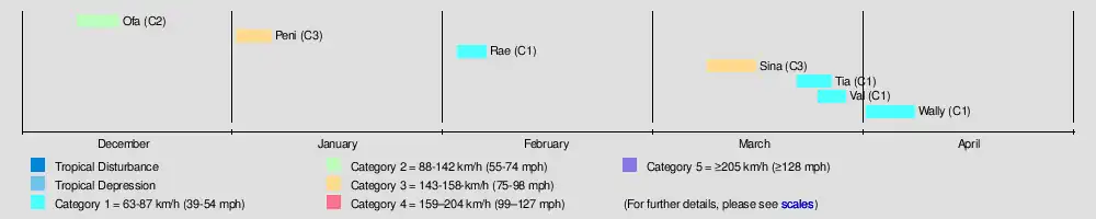 | Ofa | December 9 – 15 | Category 2 tropical cyclone | 100 km/h (65 mph) | 980 hPa (28.94 inHg) | Wallis and Futuna | |||