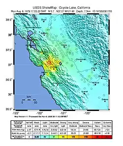 The 1979 Coyote Lake earthquake occurred at 10:05:24 local time on August 6 with a moment magnitude of 5.7 and a maximum Mercalli Intensity of VII (Very strong). The shock occurred on the Calaveras Fault near Coyote Lake in Santa Clara County, California and resulted in a number of injuries, including some that required hospitalization. Most of the $500,000 in damage that was caused was non-structural, but several businesses were closed for repairs. Data from numerous strong motion instruments was used to determine the type, depth, and extent of slip. A non-destructive aftershock sequence that lasted throughout the remainder of the month was of interest to seismologists, especially with regard to fault creep, and following the event local governments evaluated their response to the incident.