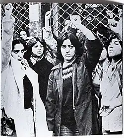 During the mass protests leading to the revolution, women participating in the protests often wore the veil, and women who appeared unveiled were often harassed by fundamentalist revolutionaries.[5] Two slogans of the 1979 revolution were: "Wear a veil, or we will punch your head" and "Death to the unveiled".[6][1] In 1978–1979, in the dawn of the Islamic Revolution, the anti-Shah front consisted of a very broad group of liberals, religious nationalists, militant Islamists, Marxists-Leninists, bazaaris, and striking oil workers.[1] Yet it was Ayatollah Khomeini, a Shia cleric, who quickly established himself as the revolution's major leader.[1] In his goal to overthrow the shah, he actively encouraged women to join the cause, but, simultaneously, showed little to no indication that he wanted to introduce mandatory veiling, or even wished to abrogate specific women's rights in a post-revolutionary Iran.[1] It was upon his return to Iran that his rhetoric and that of his political allies quickly shifted.[1]