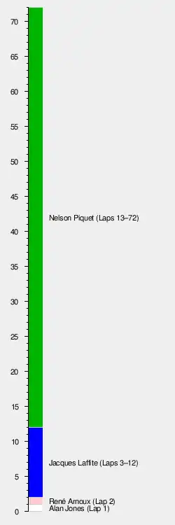 Jones was three laps down in eleventh, his championship now in real danger as Piquet had closed to within two points. Reutemann now led the battle for third by a point over Laffite and three over Arnoux. Williams now had one hand firmly on the constructors' trophy, leading Ligier by 25 points and Brabham by 35 with Piquet's teammates providing virtually no support to the constructor's tally.
