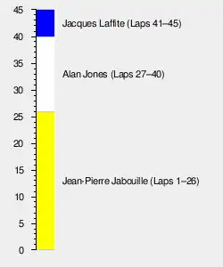 Jean-Pierre Jabouille led early with Arnoux third behind Jones. Both Renaults suffered engine failures within a lap of each other leaving Jones to lead until he made a pitstop following a tyre puncture after the second chicane, dropping him behind Laffite and Reutemann.
