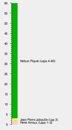 The front row of the grid was occupied by the Renaults of René Arnoux and Jean-Pierre Jabouille, although Piquet led by lap 4 and was never headed. On lap 6, Villeneuve crashed his Ferrari heavily at the corner which now bears his name, following a puncture. Villeneuve escaped unhurt, but the incident also caused the retirement of Bruno Giacomelli, who ran over some of the debris in his Alfa Romeo. Jones moved up to second on lap 29 after running as low as seventh. Behind Reutemann, Elio de Angelis finished fourth in his Lotus, with Keke Rosberg fifth in his Fittipaldi and Didier Pironi sixth in his Ligier.