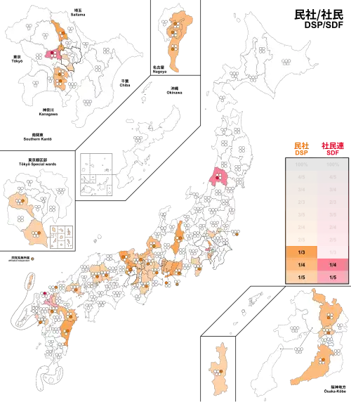 | LDP | JSP | Kōmeitō | DSP | JCP | NLC | SDF | Ind. | ||