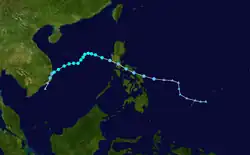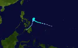 On 16 May, a tropical disturbance began developing west of Kosrae.[14] Three days later, the JMA designated the disturbance as a tropical depression,[7] with the JTWC issuing a TCFA on the system just a few hours after.[14] The next day, both the JMA and JTWC designated the depression as a tropical storm, with the latter agency naming it Forrest.[7][14] On 22 May, Forrest crossed into the PAR, being named Gloring by PAGASA.[3] Steadily developing, the next day, both the JMA and JTWC noted that Forest had peaked with sustained winds of 55 kn (65 mph; 100 km/h).[7][14] After making landfall in Luzon on 25 May, Forrest rapidly weakened,[14] and on 26 May, both PAGASA and the JTWC stopped tracking Forrest.[3][14] The JMA kept tracking a weakening Forrest until it dissipated on 29 May.[7]