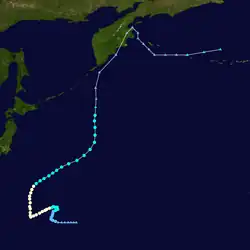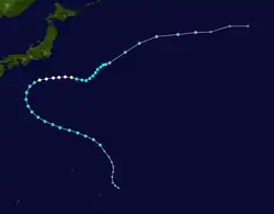 On 11 May, a tropical disturbance located in an equatorial trough east of Chuuk Lagoon began developing. Despite initially showing signs of weakening, the next day, it rapidly developed, becoming a tropical storm a few hours later, causing both the JTWC and JMA to issue their first advisories early on 13 May, with the former naming it Ellen.[13][7] Slightly weakening for a few hours, on May 15, Ellen rapidly intensified, becoming a typhoon a few hours later. Soon after, Ellen deepened significantly, reaching a minimum pressure of 930 mbar (27 inHg) later that day.[7] The next day, the JMA noted that Ellen had peaked with 10-minute sustained winds of 105 kn (120 mph; 195 km/h)[7] while the JTWC stated that Ellen peaked with 1-minute sustained winds of 110 kn (125 mph; 205 km/h).[13] Shortly after, Ellen began recurving northwest towards Japan, weakening as it neared the extratropical cyclone which absorbed Dom. On 21 May, Ellen merged with the cyclone, causing the JTWC to stop tracking it.[13] The JMA kept tracking it until 25 May.[7]