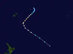 The tropical cyclone developed 160 km/100 mi northeast of western Samoa and travelled southwest at 12 knots, moving through the Ha'apai island group and only 50 km/30 mi northwest of Tongatapu. The pressure at Tongatapu fell to 976.4 mbar (28.83 inHg). Winds of 92 knots were measured at Nuku'alofa,[1] and rainfall of 120 millimetres (4.7 in) was measured there. Isaac reached maximum intensity on March 2. The tropical cyclone was the worst storm in Tonga's history, devastating the island group.[2] The island groups of Ha'apai and Vava'u were hit worst. Six were killed,[1] while 45,000 became homeless and 95% of the livestock was killed.[3] The island of Tatafa was bisected by a 16 metres (52 ft) wide channel caused by Isaac's storm surge.[4]