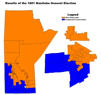 The 1981 Manitoba general election was held on November 17, 1981 to elect Members of the Legislative Assembly of the Province of Manitoba, Canada. It was won by the opposition New Democratic Party, which took 34 of 57 seats. The governing Progressive Conservative Party took the remaining 23, while the Manitoba Liberal Party was shut out from the legislature for the only time in its history. The newly formed Progressive Party failed to win any seats.