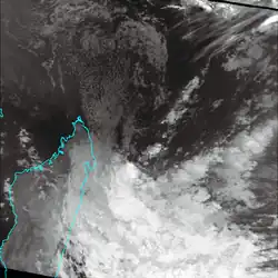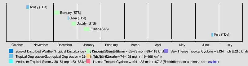 There were six storms named by the weather service in Madagascar or Mauritius, with advisories issued by Météo-France's meteorological office at Réunion (MFR).[1] At the time, the MFR area of warning responsibility was from the coast of Africa to 80° E, and the agency primarily used the Dvorak technique to estimate the intensities of tropical cyclones.[4] The Joint Typhoon Warning Center (JTWC), which is a joint United States Navy – United States Air Force task force that issues tropical cyclone warnings for the region,[5] also tracked a short-lived tropical storm in February, which formed on February 5 northeast of Mauritius. The system tracked to the southeast, reaching peak winds of 65 km/h (40 mph) before dissipating on February 8 northwest of Rodrigues.[6]