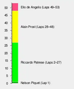 Shortly before half distance, Piquet made the first planned mid-race fuel and tyre pit stop in modern F1 history. He rejoined in fourth place, behind Prost and Elio de Angelis, and just ahead of Keke Rosberg. Shortly afterwards, Patrese made his stop, having built up a sufficient lead to rejoin the race still in first place. However, the Italian suffered an engine failure three laps later, leaving Prost to inherit a comfortable lead from de Angelis.