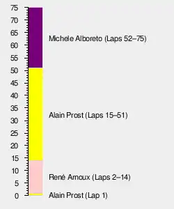 For the first ten laps, the Renaults steadily pulled away from Alboreto, with Arnoux now leading Prost. The Tyrrell began to match Arnoux's times, however, and then to close on him, as Prost took back the lead on lap 15. Speculation of a problem with Arnoux's car proved true, as the Renault was faltering, and he retired on lap 21.