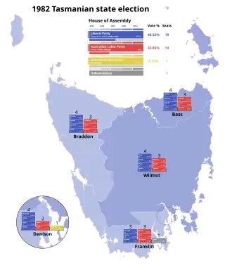 The 1982 Tasmanian state election was held on 15 May 1982 in the Australian state of Tasmania to elect 35 members of the Tasmanian House of Assembly. The election used the Hare-Clark proportional representation system[1] — seven members were elected from each of five electorates. The quota required for election was 12.5% in each division.