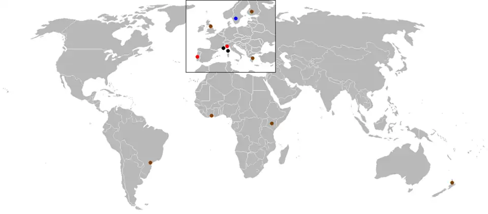 | Black = Tarmac | Brown = Gravel | Blue = Snow/Ice | Red = Mixed Surface |