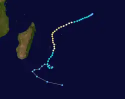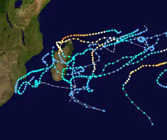 During the season, the Réunion Meteorological Service tracked storms in the basin, using the Dvorak technique to estimate tropical cyclone intensities via satellite imagery.[1] The agency later became Météo-France's meteorological office at Réunion (MFR). At the time, the basin extended from the east coast of Africa to 80° E.[2] Eleven storms were named by the Mauritius Meteorological Service and the Madagascar Meteorological Service.[1] The rest of the naming list was Lalao, Monja, Nora, Olidera, Pelazy, Rija, Saholy, Tsira, Vaosolo, Wilfredy, Yannika, and Zozo.[3] The 11 named storms were slightly above the normal of 9, most of which formed in January and February. There were four intense tropical cyclones, which is twice the average. The increased activity of the season was in part due to enhanced easterlies, a strong monsoon trough, and warm water temperatures around 28 °C (82 °F) which extended to 25° S.[4]