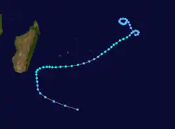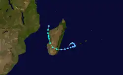 Cyclone Andry reached peak winds of December 9, when MFR estimated winds of 170 km/h (105 mph). The next day, JTWC estimated 1 minute winds of 240 km/h (150 mph).[13] Around that time, Andry was passing just north of the northernmost tip of Madagascar at Diego-Suarez, where the storm produced wind gusts of 250 km/h (155 mph).[1] The cyclone weakened while curving to the southwest and later to the south,[13] making landfall on western Madagascar near Majunga with wind gusts of 198 km/h (123 mph). While over land and turning to the southeast, Andry rapidly weakened into a tropical depression, which later passed near the capital Antananarivo. The storm emerged back into the Indian Ocean on December 14, by which time the system was disorganized.[1] That day, MFR estimated that Andry dissipated, although the JTWC assessed that the system re-intensified slightly and turned sharply southwestward before dissipating over Madagascar on December 16.[13]