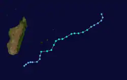 On December 19, a tropical disturbance formed near Diego Garcia, which initially tracked to the south-southeast before turning to the southwest. Later that day, the system intensified to moderate tropical storm status, prompting the Mauritius Meteorological Service to name it Bakoly. The storm gradually intensified into an intense tropical cyclone, reaching peak winds of 170 km/h (105 mph) on December 23. After maintaining that intensity for about 12 hours, Bakoly weakened below cyclone status as it turned to the south-southeast. On December 25, the storm passed between Réunion and Mauritius, and later resumed its south-southwest trajectory. After executing a small loop, Bakoly turned to the southeast and dissipated on December 30.[1][15]