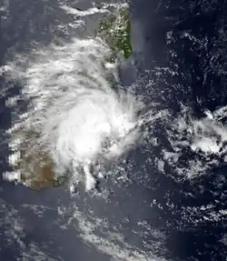MFR began tracking a tropical disturbance in the Mozambique channel on January 4. The next day, the agency estimated the system intensified into a moderate tropical storm,[18] prompting the Madagascar Meteorological Service to name it Caboto.[1] The storm moved southward along Madagascar's western coast, reaching peak winds of about 65 km/h (40 mph).[18] Caboto made landfall on January 7 to the north of the mouth of the Mangoky River, and crossed the southern portion of the country, emerging near Farafangana into the Indian Ocean. Winds associated with the storm reached 43 km/h (27 mph) at Morondava on the west coast and 63 km/h (39 mph) at Farafangana on the east coast. A developing ridge caused Caboto to slow after it reached open waters, executing a partial loop southwest of Réunion before turning to the south and dissipating on January 10.[1]
