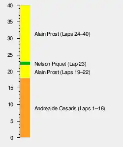 Andrea de Cesaris jumped from third to first at the start, overtaking Alain Prost and Patrick Tambay, and de Cesaris began to build up a lead on Prost who faced pressure from the Ferraris behind him. After initially challenging Tambay for the last podium place, René Arnoux began to fall back and was caught by Nelson Piquet with Keke Rosberg following a short distance back in 6th. Piquet got a good exit out of La Source, and powered down the hill to overtake Arnoux before Eau Rouge, leaving him in the attention of the non-turbo powered Williams cars who don't get a chance to pass before Arnoux's turbo failed, putting an end to his race a few laps later. De Cesaris pitted from the lead, but it was a slow stop, over 25 seconds, and the second stint got going with Prost leading by almost 10 seconds. Prost's mechanics did a 14.4 second stop in an era when the record was around 13.