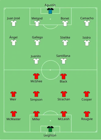 Prior to the match, the pitch had been covered by tarpaulin in order to protect it from the rain. The referee made an inspection of the pitch prior to kick-off and determined that the surface was fit to play upon.[16] The match started, and Aberdeen immediately went on the attack. Madrid's goalkeeper Agustín misdirected a goal kick, Gordon Strachan broke away from his marker and chested the ball down. He lobbed the ball forward to Eric Black who hit a twenty-yard volley towards the Madrid goal. Agustín saved the shot, tipping it onto the crossbar of the goalframe. Strachan took the corner, crossing it to Alex McLeish. The ball deflected off McLeish's head, and Black pounced on the ball sending it into the back of the Real Madrid goal to put Aberdeen up 1–0.[16]