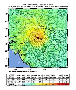 On December 22, 1983, an earthquake with a magnitude of 6.3 struck northern Guinea, killing around 300 people, and injuring 1,500. Around 200 people went missing. An earthquake of this magnitude was unusual for this region of West Africa, which was previously believed by most seismologists to be aseismic.[1] The earthquake destroyed 5,000 houses. It had an intensity of IX (Violent) on the Mercalli intensity scale,[1] although USGS reported it as VIII (Severe).[2] The earthquake caused cracks in the ground, and an entire cavern to collapse.[1]