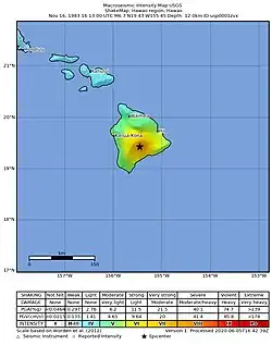 The 1983 Kaoiki earthquake struck southern Hawaii Island on the morning of November 16, 1983. Measuring Mw 6.7, it was the largest to hit the island since 1975. The epicenter was located 50 km (30 mi) southeast of Hilo with an approximated depth of 12 km (7 mi). The shallow strike-slip earthquake was assigned a maximum intensity of IX (Violent) on the Modified Mercalli scale. 6 people were injured, widespread damage and landslides were reported across the island.