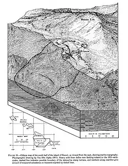 The epicenter in Kaoiki lies within a valley between the western slope of Mauna Loa, and northwest of Kīlauea. Seismicity in the area is caused by the continuous movement of the Kilauea and Mauna Loa slumps generated by the continuous magmatic flow underground. This strain forms the many faults around the Kilauea block and the notable Hilina Slump. The slump is situated underwater—below the southern flanks of Kilauea. As the block continues to stretch at around 10 cm/year seaward, the crust becomes thinner, causing cracks, fissures and a trend of aligning normal faults.[1] The Kaoiki Pali is an example of a Hilina slump induced normal fault, striking northeast and stretching 25 km (15.5 mi) across the Mauna Loa and Kilauea boundary.[2] The scarps that the Kaoiki Pali produces have vertical displacements of up to 100 m (300 ft). While these displacements are present in large amounts, most of these faults have not moved in over 9,500 years. However, this slump also affects the ground level sliding on Mauna Loa. Although rarely, when it occurs, it causes major fractures due to its narrow connection with Kilauea. This displacement is what causes the extensive strike-slip faults and earthquakes in the area. And as these faults rupture, it produces major earthquakes above magnitude 6 that inflict extreme damage and casualties; along with deadly tsunamis and landslides as observed in 1975 and 1868.[2][3]