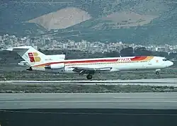 The aircraft operating as Iberia Flight 350, manufactured by Boeing in 1974, was a 9-year-old Boeing 727-256 registered as EC-CFJ with serial number 20820 and line number 1019. It was equipped with three Pratt & Whitney JT8D-9 engines and logged a total of 21,525 total airframe hours in 19,936 takeoff and landing cycles.[3][4]