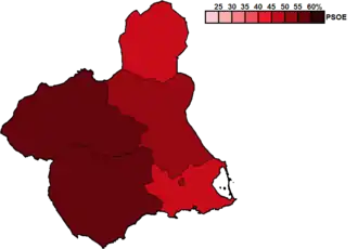 The Spanish Socialist Workers' Party (PSOE) won the election with a landslide victory, securing an absolute majority in both seats and votes. The People's Coalition, an electoral alliance led by the right-wing People's Alliance (AP) and including the People's Democratic Party (PDP) and the Liberal Union (UL), became the second political force, whereas the Communist Party of Spain (PCE) entered the Assembly with 1 seat. Despite initial expectations and high opinion poll results, as well as a strong performance in the Campo de Cartagena area with over 12%, the Cantonal Party (PCAN) remained an extra-parliamentary political force due to it failing to reach the 5% regional threshold.[1] The former ruling party of Spain, the Union of the Democratic Centre (UCD), had chosen to dissolve itself in February 1983 and did not contest the election as a result.[2]