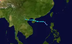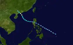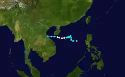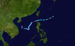A tropical disturbance first noted east of the Philippines, the system moved through the archipelago as a tropical depression before strengthening briefly to a typhoon in the South China Sea. A combination of northeasterly vertical wind shear and proximity to land weakened the cyclone to a tropical storm before its landfall on Hai-nan and struck Chan Chiang, China as a tropical depression.[9] Winds peaked at 34 knots (63 km/h) at Tate's Cairn in Hong Kong.[1]