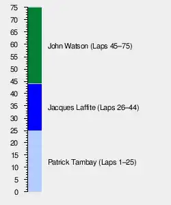 Laffite was now in the lead, with Patrese in second. By lap 28, the McLarens were lying third and fourth, having passed Marc Surer, Sullivan and Johnny Cecotto. When Watson got by Lauda at the end of Shoreline Drive, he was 20 seconds behind the two leaders. With Watson closing the gap to the front and Laffite's tires going off quickly, Patrese challenged Laffite for the lead. He slid wide, and Watson and Lauda both passed before he rejoined the track. Soon after, the McLarens passed Laffite as well, and, from 22nd and 23rd on the grid, were now first and second.