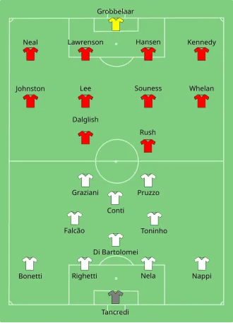 The opening passages of the match were tentative. Faced with a hostile atmosphere, Liverpool were content to sit back and frustrate Roma.[15] Despite this tactic, Liverpool took the lead in the 15th minute. Souness and Sammy Lee exchanged passes before passing to Craig Johnston on the right-hand side of the pitch. Johnston played a high cross into the Roma penalty area, which was challenged for by Roma goalkeeper Franco Tancredi and Ronnie Whelan. The result was that Tancredi dropped the ball, Roma defenders tried to clear the ball, but Michele Nappi's attempted clearance bounced off Tancredi's back and fell to Liverpool defender Phil Neal who scored to give Liverpool a 1–0 lead.[16] Two minutes later, Souness volleyed the ball into the Roma goal from close range, but his goal was disallowed for offside.[17]