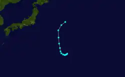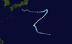 Development of this system was slow within the eastern portion of the monsoon trough. By midday on July 2, the disturbance was first noted about 1,020 kilometres (630 mi) southwest of Guam. The system moved northwest for much of its life cycle, initially following Alex and then the southwest side of the subtropical ridge. A broad tropical depression formed on the afternoon on July 5 within the disturbed weather area, weakening as it passed over Luzon. Late on July 7, ship reports indicated the system had become a tropical storm. The cyclone moved within the radar fence of Hong Kong near its peak intensity before making landfall 250 kilometres (160 mi) to its west-southwest during the early afternoon of July 9. Winds gusted to 70 knots (130 km/h) at Green Island.[1] Weakening over the topography of China was rapid thereafter, and the system dissipated by early on July 10.[6]