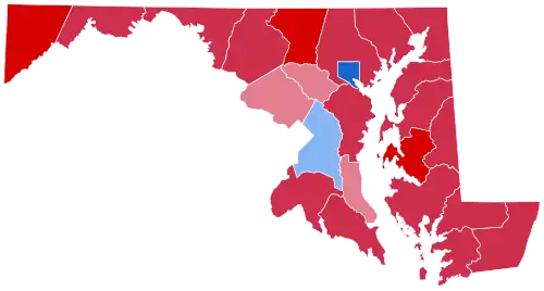 Reagan won all but one of the state's 23 counties. The race was close, however, due to Mondale's strong performances in largely African-American Baltimore City and Prince George's County. Reagan also won Montgomery County in the Washington suburbs by only 888 votes out of almost 300,000 cast; this was the last time to date that a Republican has won this county.[5] This also marks the last time the Democratic candidate was held below 60% of the vote in neighboring Prince George's County.[6]