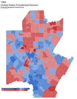 Reagan won the state by sweeping the small towns and rural areas of central Pennsylvania and performing well in the traditionally Republican suburbs of Philadelphia, but the race was kept within single digits by Mondale’s strong showing in heavily unionized and traditionally Democratic Western Pennsylvania, as well as his decisive victories in the cities of Pittsburgh and Philadelphia. As of the 2024, this is the last election in which Lackawanna County has voted Republican, the last time that Erie County voted Republican until 2016, and the last time a Republican won one-third of the vote in Philadelphia.[1]