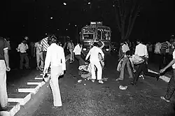 After the assassination of Indira Gandhi on 31 October 1984 by two of her Sikh bodyguards, anti-Sikh riots erupted the following day. They continued in some areas for several days, in which 3,000-17,000 people were killed.[4][8] At least 50,000 Sikhs were displaced.[4] Sultanpuri, Mangolpuri, Trilokpuri, and other Trans-Yamuna areas of Delhi were the worst affected. Perpetrators carried iron rods, knives, clubs, and combustible material (including kerosene and petrol). They entered Sikh neighbourhoods, killing Sikhs indiscriminately and destroying shops and houses. Armed mobs stopped buses and trains in and near Delhi, pulling off Sikh passengers for lynching; some were burnt alive. Others were dragged from their homes and hacked to death, and Sikh women were reportedly gang-raped and Sikhs also had acid thrown on them.[53][3]