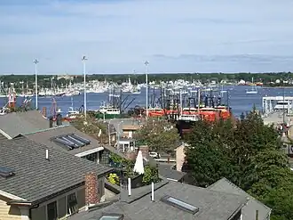 New Bedford, Massachusetts, is a seaside port city situated at the mouth of the Acushnet River, where it shares a natural harbor with the towns of Acushnet and Fairhaven along the state's South Coast.[1][2] During the late 1800s and early 1900s, the city had an economy supported by its large whaling and textile industries, though starting in the early 1900s, as these industries went into decline, the city's commercial fishing industry grew.[3][4][5] In the early 1900s, the introduction of more powerful diesel engines allowed ships from New Bedford to travel further from the port to Georges Bank, 175 miles (282 km) off the coast of Cape Cod.[1] During this time, the port quickly becomes a major processing location for sea scallops, and shortly after World War II, 80 percent of the sea scallops caught off of the coast of the United States were being unloaded in New Bedford.[3] In the 1930s, a permanent trade union was established amongst the fishermen in the city.[6]