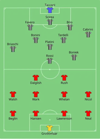 Watched by a crowd of 58,000, the first half was goalless. Juventus took the lead in the 56th minute when Michel Platini scored from a penalty after Gary Gillespie was adjudged to have brought down Zbigniew Boniek in the penalty area, although the foul was actually committed nearly a yard outside the area and the referee was far from the action.[3] The score remained the same throughout the remainder of the match and Juventus won 1–0, achieving their first European Cup win and became the first club to have won all three major European trophies at the time (European Cup/UEFA Champions League, UEFA Cup/UEFA Europa League, and the Cup Winners' Cup).