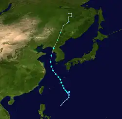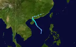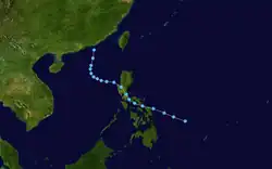 A tropical depression formed 1,050 kilometres (650 mi) east-southeast of Manila on July 4. Moving west-northwest, the system crossed the central Philippines on July 5, moving into the South China Sea on July 6. Moving more towards the north on July 7, the depression moved inland into southern China east of Hong Kong on July 8. In Hong Kong, winds gusted to 47 knots (87 km/h) at Tate's Cairn, where 114.1 millimetres (4.49 in) fell.[1] While Hong Kong considered it a tropical depression throughout its life cycle, PAGASA named the system and considered it a tropical storm.[7]