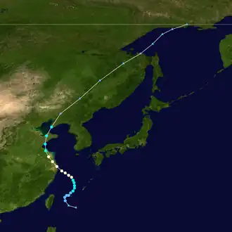 The monsoon trough spawned a tropical depression in northwest of Guam on July 21. It tracked northward, becoming a tropical storm on the 22nd and reaching its first peak of 70 mph (110 km/h) winds on the 23rd. An upper-level trough outran the system, forcing Jeff westward into a shearing environment and weakening it to a depression on the 26th. The shear abated, and Jeff was able to restrengthen, becoming a storm on the 27th and a typhoon on the 29th. The 85 mph (137 km/h) typhoon hit eastern China on the 30th. It brought the heaviest rain to Shanghai since 1962.[1] Jeff weakened rapidly to a depression, but upon reaching the Yellow Sea, it again restrengthened to a tropical storm on the 1st. Jeff reached a third peak of 60 mph (97 km/h) winds before becoming extratropical on the 2nd. A total of 245 people were killed from this storm,[1] with moderate to heavy damage to crops.[8]