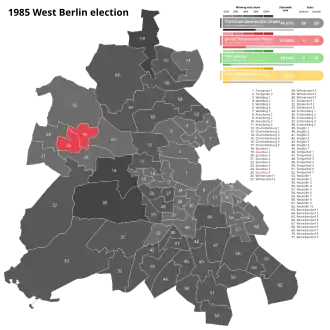 The 1985 West Berlin state election was held on 10 March 1985.[1] Eberhard Diepgen was the CDU's lead candidate and would later be unanimously elected as the mayor of West Berlin.[2]