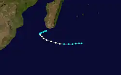 Several areas of convection persisted within the ITCZ in early March across the open Indian Ocean. One of these organized into a tropical storm on March 2 about 700 km (430 mi) south of Diego Garcia and was given the name Daodo.[21][22] On the following day, the JTWC began tracking it as Tropical Cyclone 21S.[2] Daodo moved slowly initially while quickly strengthening into a severe tropical storm. On March 4, a weak ridge steered the storm to the east, and the storm weakened slightly during this time. Three days later a stronger ridge to the east turned Daodo to the southwest, bringing it over its former path. On March 8, the JTWC upgraded the storm to the equivalent of a minimal hurricane. On the following day, the MFR upgraded Daodo to tropical cyclone status, estimating peak 10 minute winds of 135 km/h (85 mph), although it weakened back into a tropical storm on March 10. The storm accelerated to the southeast on the next day and maintained much of its intensity due to baroclinic interactions with a nearby anticyclone. On March 13, Daodo turned back to the southwest before moving more southward and later to the southeast. On March 18, the storm dissipated within a polar trough northwest of Île Amsterdam.[21][22]