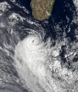 While Bemezava was still active, another circulation was present between Réunion and Madagascar on February 8. On the next day, a tropical disturbance formed about 150 km (95 mi) east-southeast of Toamasina, Madagascar. A ridge to the south caused the nascent system to move erratic, although generally to the southeast and east. It intensified into Tropical Storm Clotilda on February 10,[16][17] and on the next day that the JTWC classified it as Tropical Cyclone 17S.[2] The storm slowed and approached within 50 km (30 mi) of Réunion before stalling. It moved slowly near the island for two days, during which it remained about 30 km (18 mi) off the northern coast. On February 13, Clotilda attained peak 10 minute winds of 110 km/h (70 mph). A weak ridge steered the storm back to the southwest, and on February 14, Clotilda struck northern Réunion at Sainte-Suzanne. The ridge moved to the east, causing the storm to accelerate and gradually weaken. On February 17, Clotilda became extratropical while turning southeastward due to an approaching trough. The remnants persisted several days until dissipating on February 22 near Île Amsterdam.[16][17]