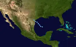 A tropical wave crossed the Caribbean sea, moving into a favorable upper environment in the western Caribbean sea on August 31. The system formed into a weak tropical depression before crossing the Yucatán peninsula, becoming better organized as it moved into the south-central and western Gulf of Mexico between September 1 and 3. The system moved ashore east-central Mexico before quickly dissipating as a tropical cyclone on September 4. Satellite imagery revealed that its residual cloud pattern persisted over Mexico for an additional couple of days before degenerating. Heavy rainfall fell primarily north of its track, with the maximum across northeast Mexico falling at El Barranco/Altamira, where a total of 9.33 inches (237 mm) was measured.[31]